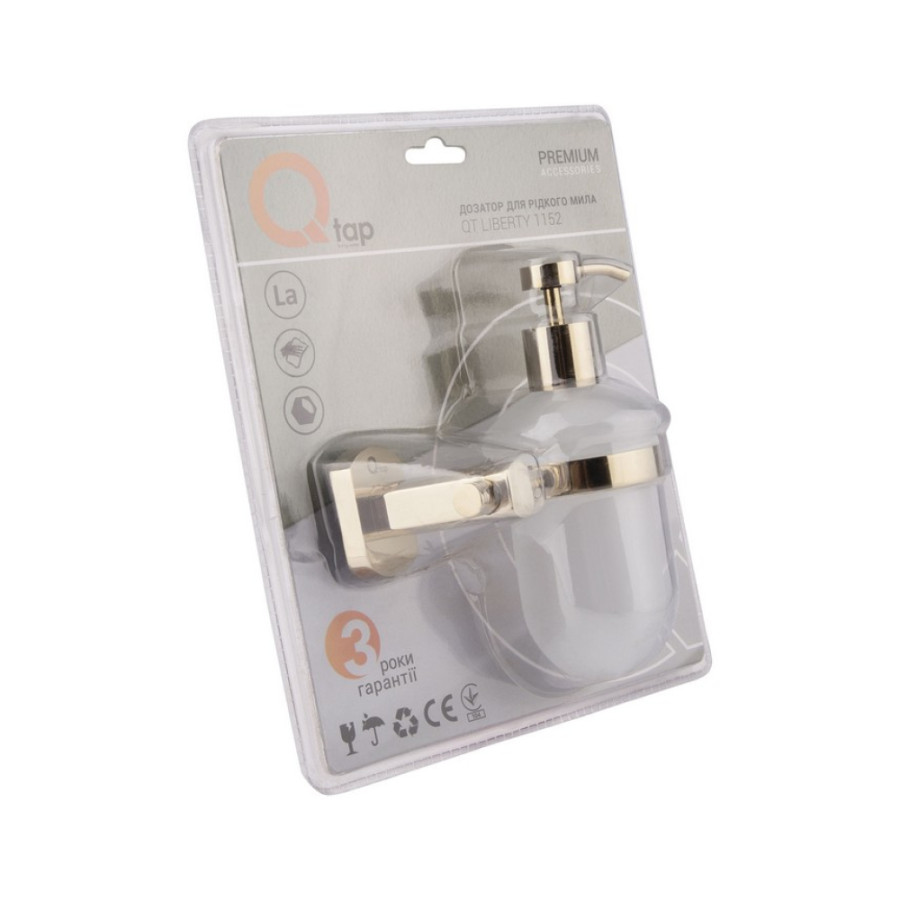 Дозатор для мила Qtap Liberty ORO 1152 робить процес миття рук гігієнічним і швидким. Латунний тримач дозатора у вигляді кронштейна з кільцем має антикорозійні властивості і кріпиться на стіну. Пляшка виконана з матового скла. Дизайн дозатора підходить за дизайном до будь-яких аксесуарів, чудово доповнить невеликі санвузли і, завдяки своїм розмірам, може кріпитися в будь-якому зручному та доступному місці. Не займає місце на раковині.