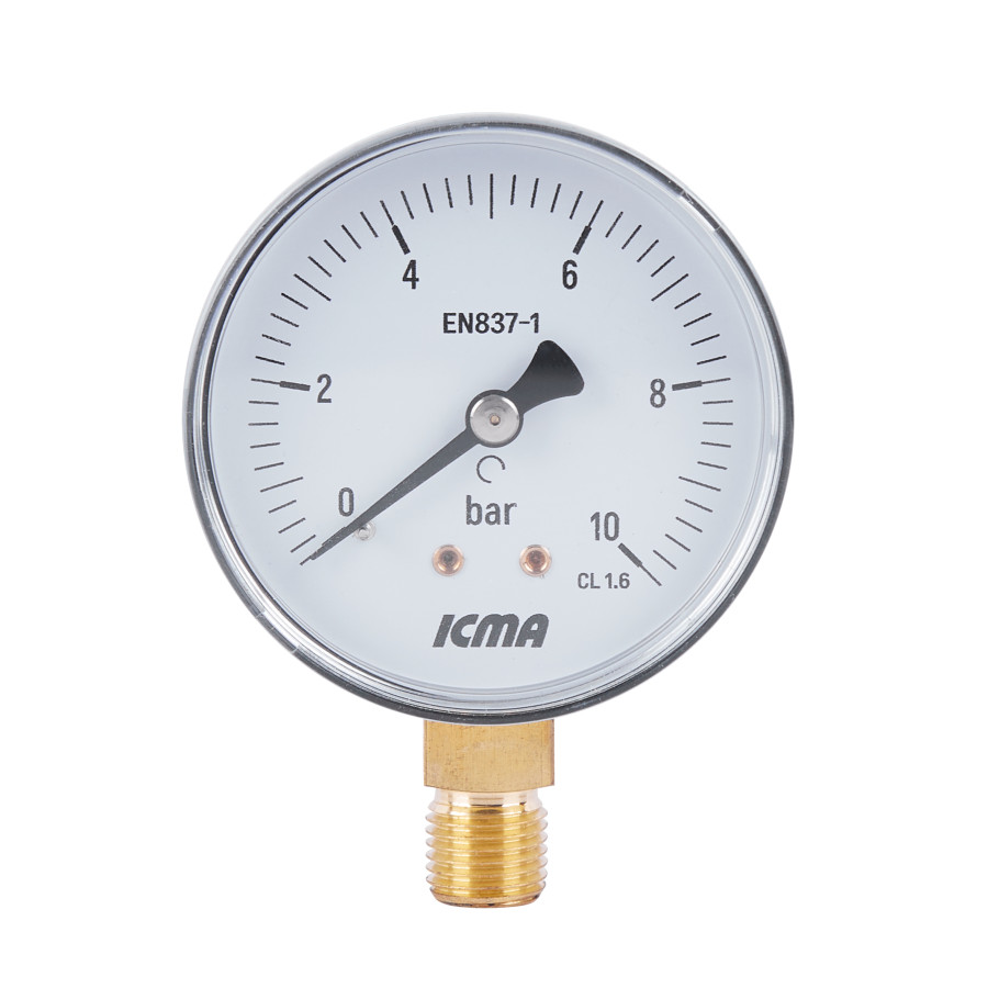 Манометр ICMA Арт. 244 має радіальне (нижнє) підключення з розміром 1/4". Призначений для вимірювання тиску від 0 до 10 бар. Максимально допустима температура рідини 60°C.