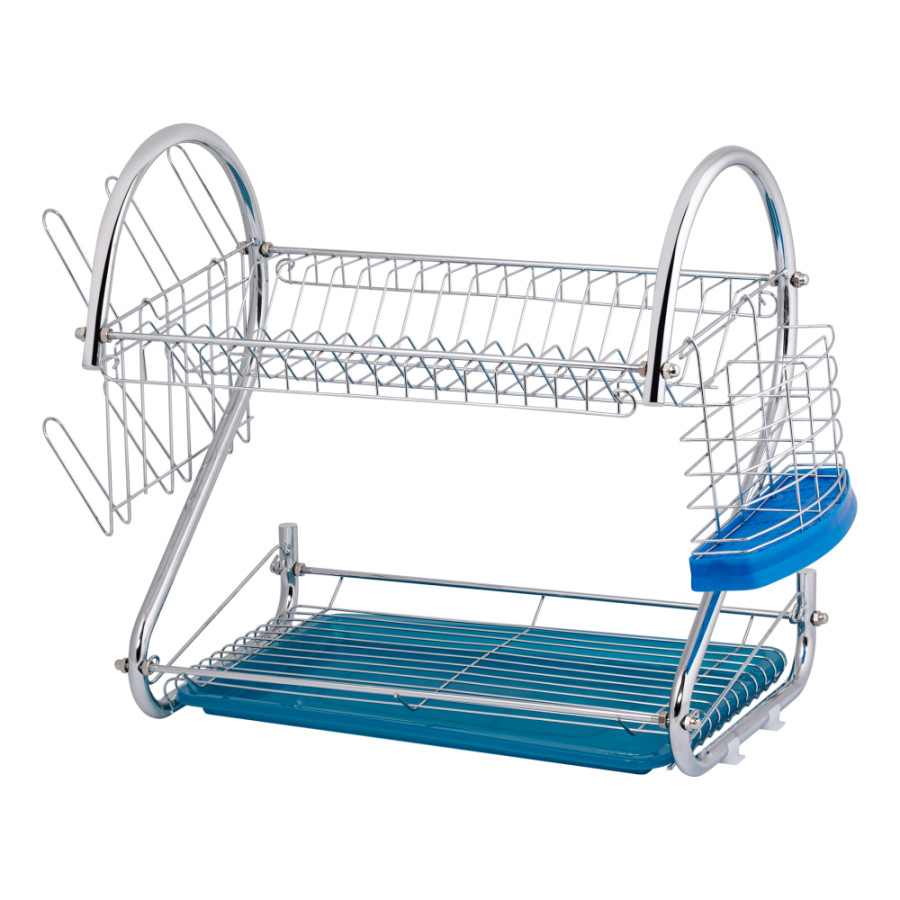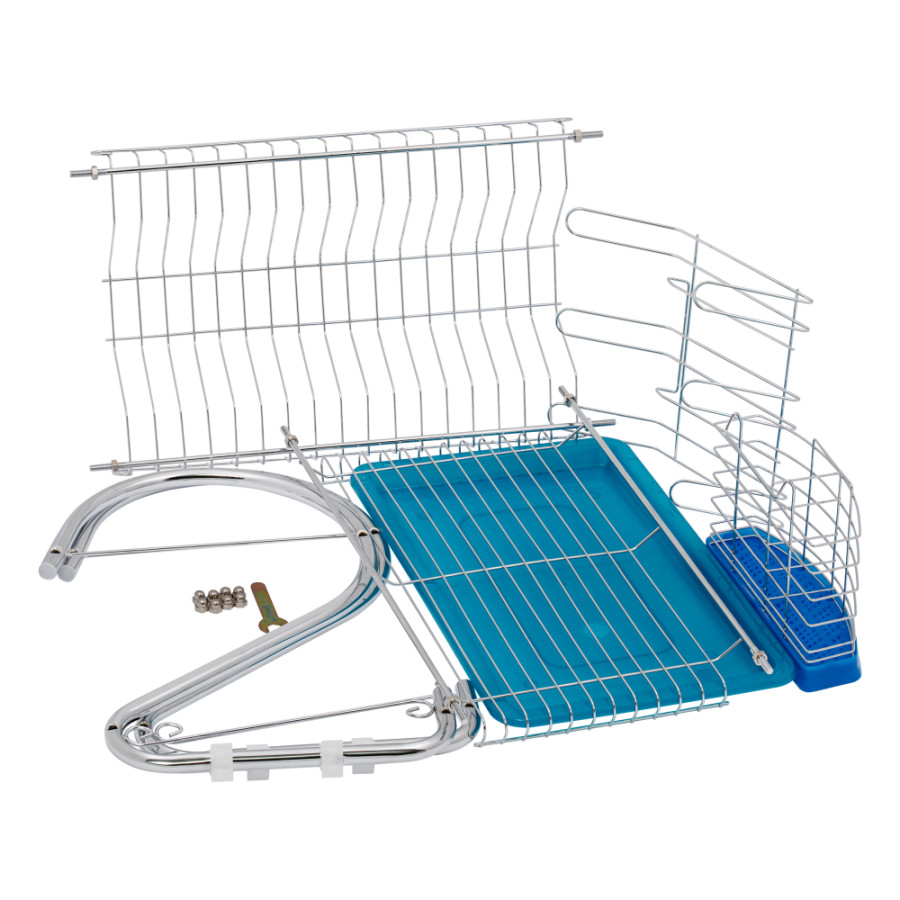 Настільна сушарка для посуду Lidz (CRM) 121.06.09 встановлюється біля мийки. Вона дозволяє зберігати посуд сухим і завжди під рукою. Виріб має підставку для ложок і виделок з синім піддоном, гачки, тримач для склянок і тримач для тарілок з синім піддоном під ними. Піддони легко знімаються й прості в очищенні.